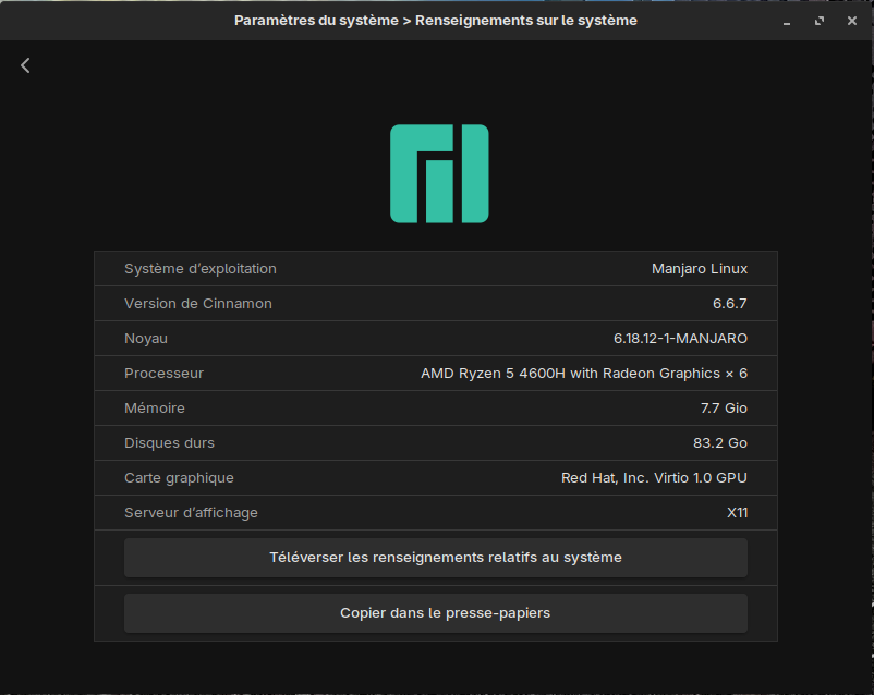 Manjaro 26.0.3 même version mais assez pour remettre l’engrenage en route avec les nouveaux composants systèmes.